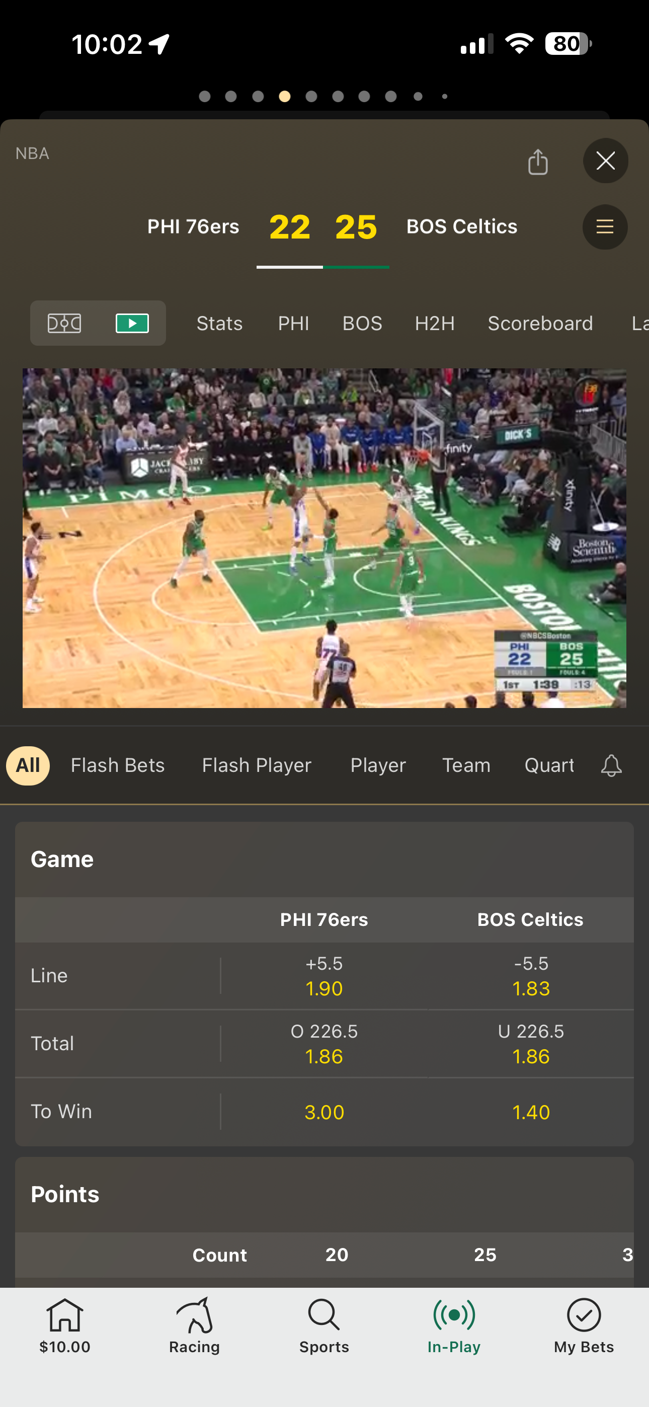 - Step 3 - Select the live betting market, such as Boston Celtics vs Philadelphia 76ers in the NBA